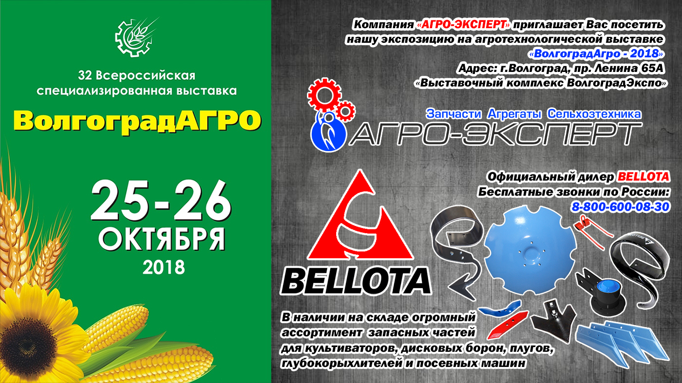 Официальный дилер испанского бренда Bellota в России ООО "АГРО-ЭКСПЕРТ" представит запасные части на: культиваторы - лапы и S-образные стойки, дисковые бороны - диски и ступицы, глубокорыхлители - долота и рукоятки со сменными наконечниками, защита стойки параплау, монтажные комплекты, крепежные элементы.